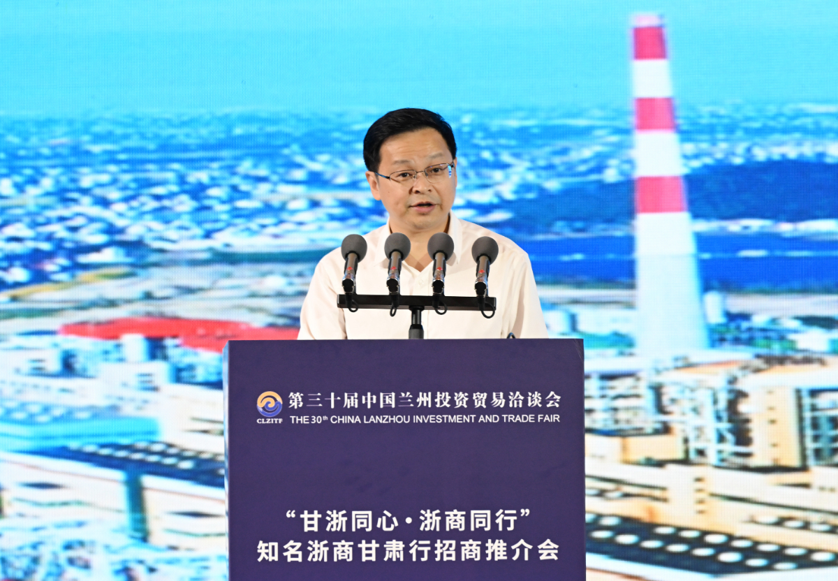 倪震在“甘浙同心·浙商同行”知名浙商甘肅行招商推介會上作主題發言。 甘肅日報盛學卿 攝