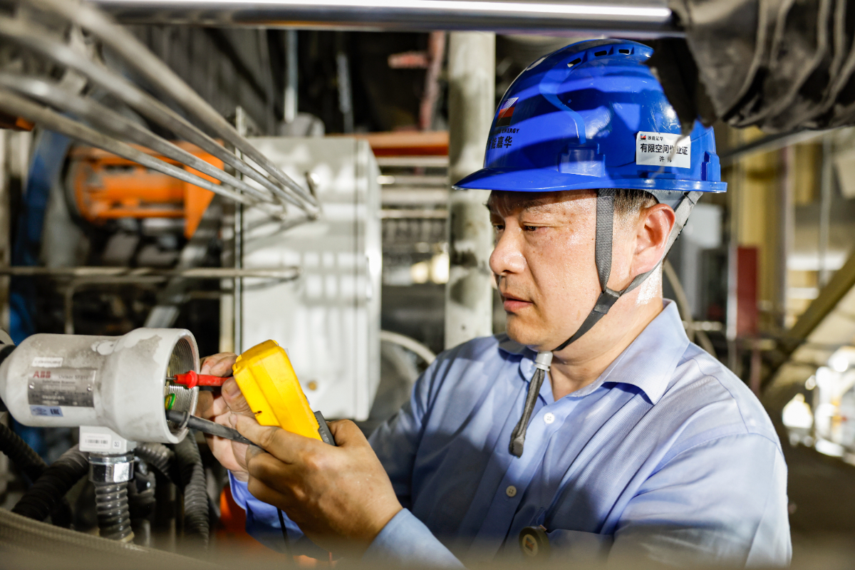 浙能集團嘉興發電廠儀控一班工作人員正冒著高溫進行設備消缺工作。 王重陽 攝