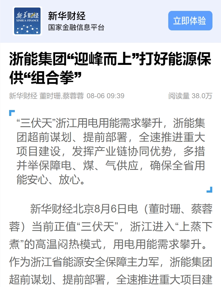 新華社客戶端、新華財經客戶端報道《打好迎峰度夏“組合拳” 浙能集團持續提升能源保供能力》。