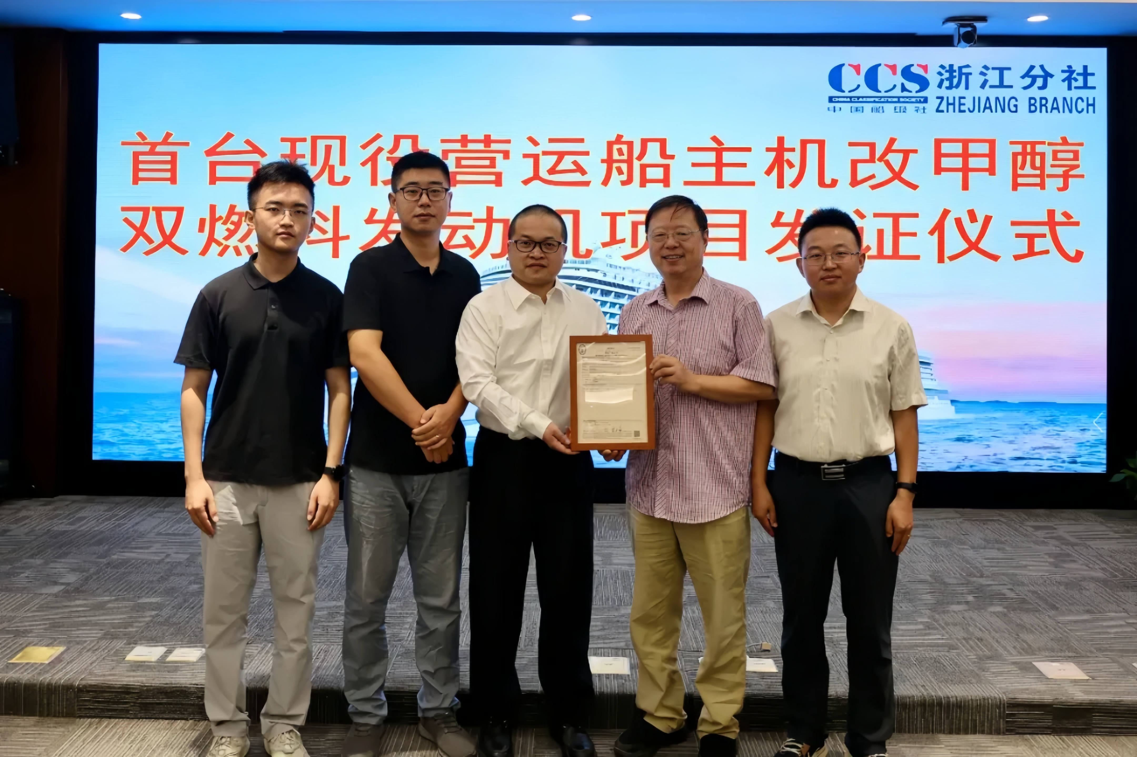 浙能邁領(lǐng)“領(lǐng)先1”輪主機獲頒首臺現(xiàn)役營運船主機改裝為甲醇雙燃料發(fā)動機項目證書。 中國船級社浙江分社 提供