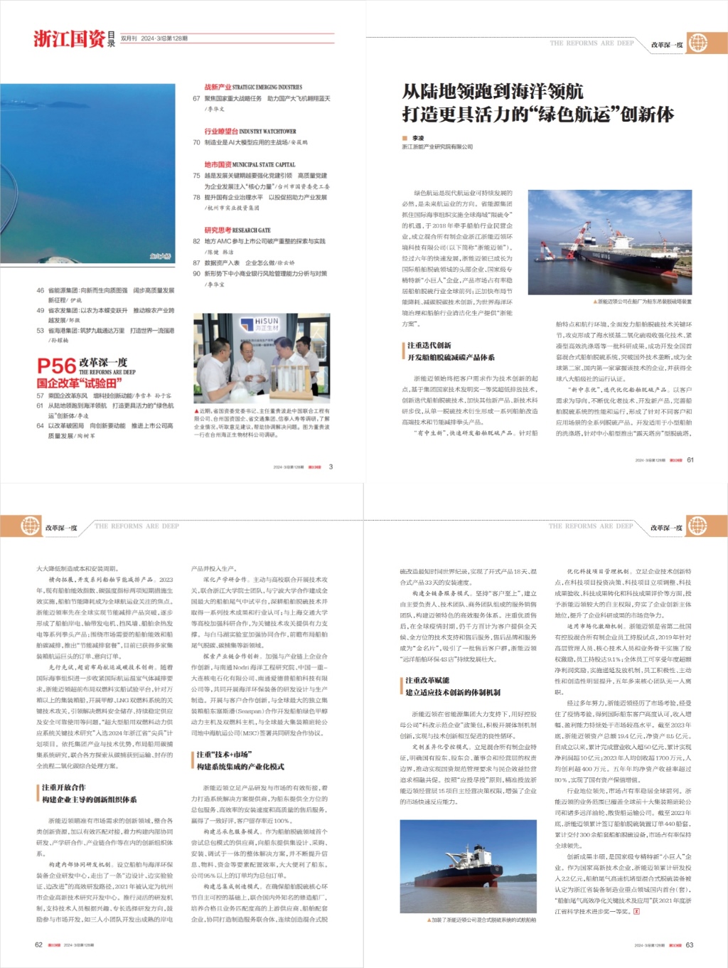 綠色航運(yùn)是現(xiàn)代航運(yùn)業(yè)可持續(xù)發(fā)展的必然,是未來航運(yùn)業(yè)的方向。省能源集團(tuán)抓住國際海事組織實(shí)施全球海域“限硫令”的機(jī)遇,于2018年?duì)渴执靶袠I(yè)民營企業(yè),成立混合所有制企業(yè)浙江浙能邁領(lǐng)環(huán)境科技有限公司(以下簡稱“浙能邁領(lǐng)”)。經(jīng)過六年的快速發(fā)展,浙能邁領(lǐng)已成長為國際船舶脫硫領(lǐng)域的頭部企業(yè)、國家級專精特新“小巨人”企業(yè),產(chǎn)品市場占有率穩(wěn)居船舶脫硫行業(yè)全球前列;正加快布局節(jié)能降耗、減碳脫碳技術(shù)創(chuàng)新,為世界海洋環(huán)境治理和船舶行業(yè)清潔化生產(chǎn)提供“浙能方案”。