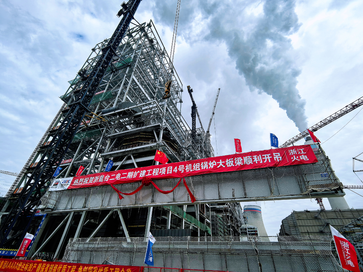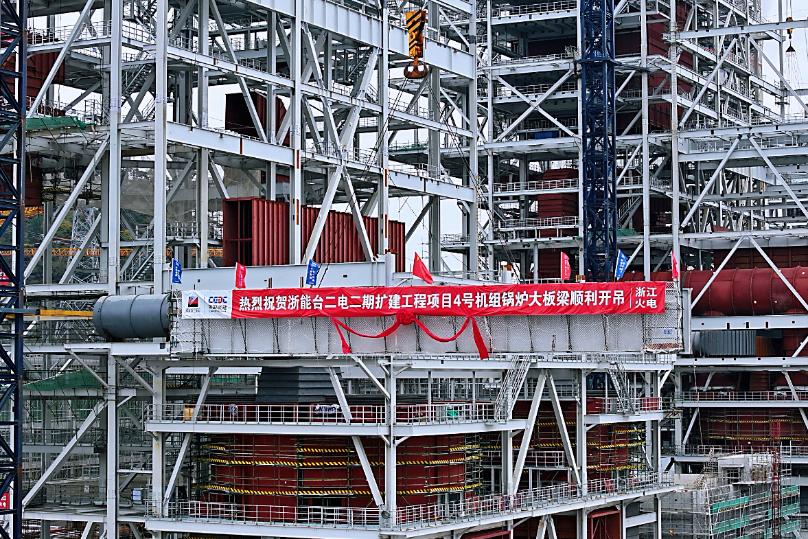 高質(zhì)量發(fā)展看“浙”里|臺二電二期擴建工程項目4號鍋爐首根大板梁吊裝就位