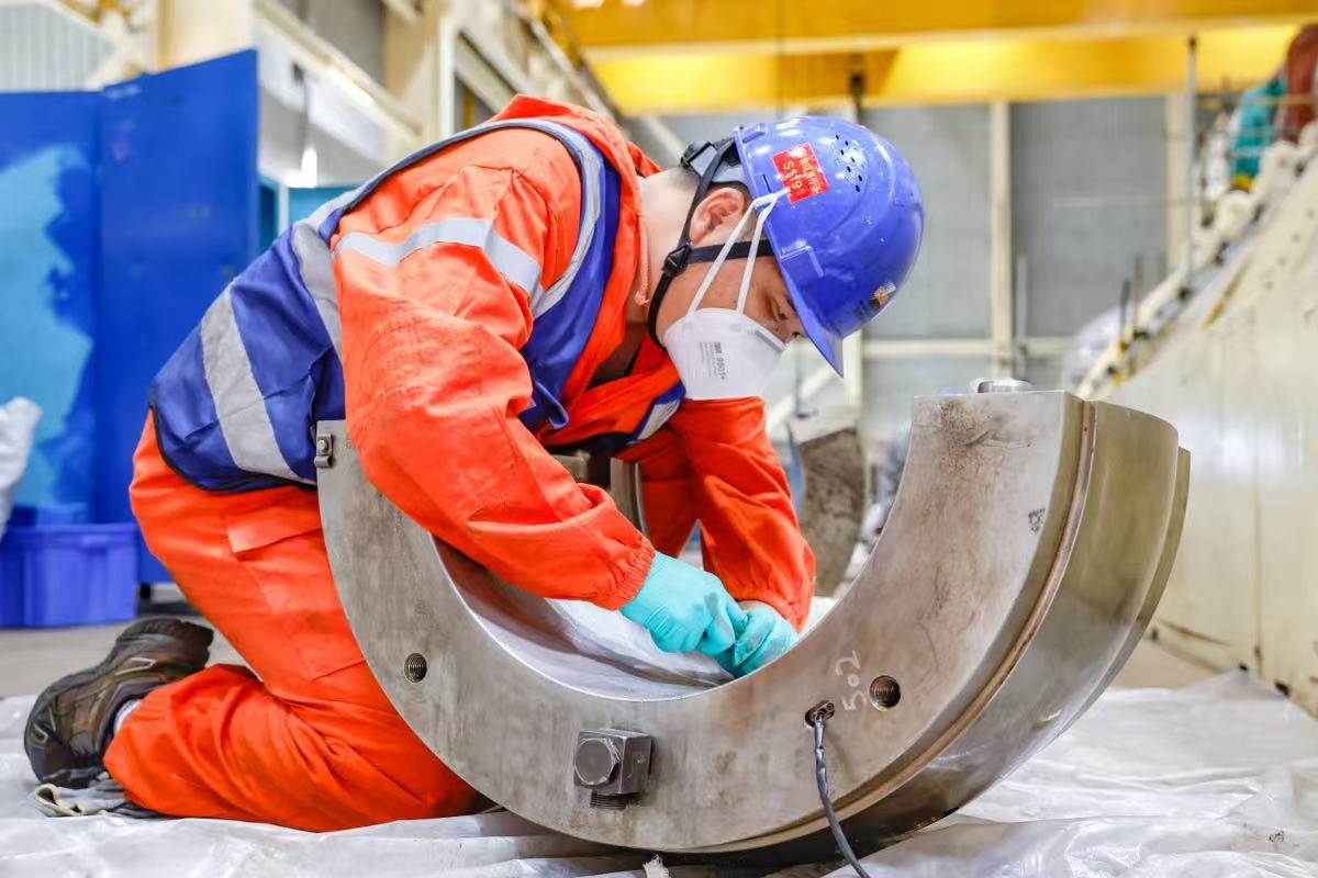 浙能嘉興發電廠的檢修人員對拆卸下來的軸瓦進行細致的修刮工作。 王侃 攝