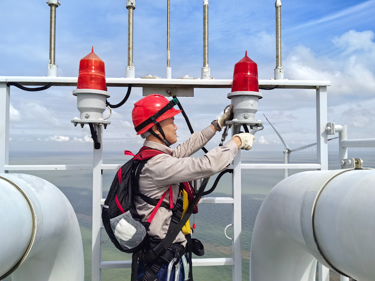 浙能嘉興海上風電場維護人員正在檢修風機航標燈。 金山 提供