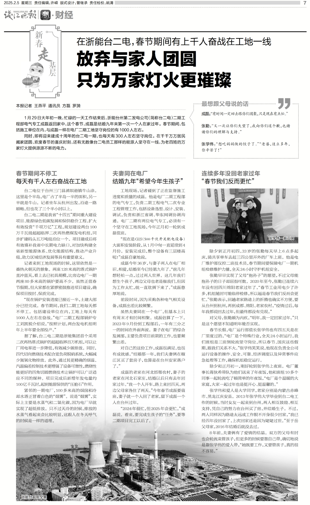 2月5日,錢江晚報整版報道《在浙能臺二電,春節期間有上千人奮戰在工地一線 放棄與家人團圓 只為萬家燈火更璀璨》。 錢江晚報 圖