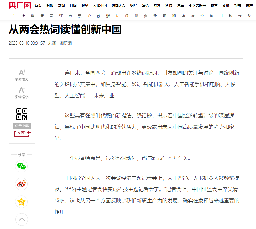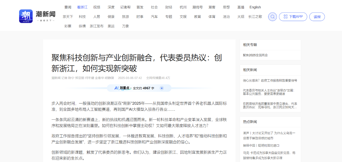 潮新聞報道《聚焦科技創(chuàng)新與產業(yè)創(chuàng)新融合,代表委員熱議——創(chuàng)新浙江,如何實現(xiàn)新突破》。 潮新聞客戶端 圖