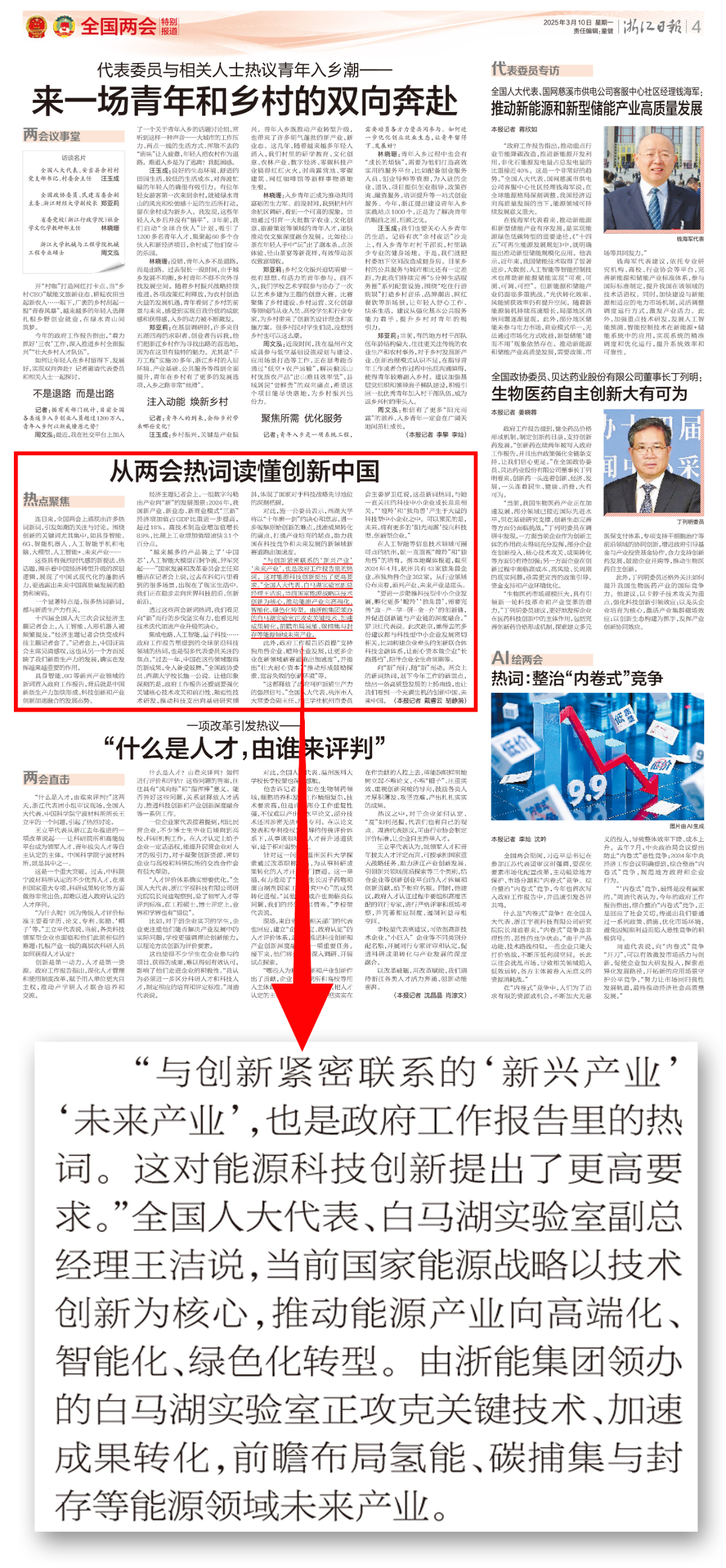 《浙江日報》全國兩會特別報道《全國人大代表、浙江省白馬湖實驗室有限公司副總經理王潔——發(fā)揮好高能級科創(chuàng)平臺“源”創(chuàng)力》。 浙江日報 圖