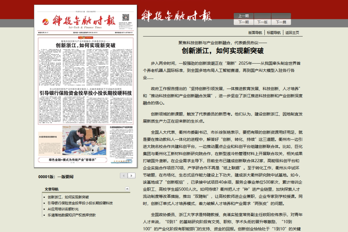《科技金融時報》報道《聚焦科技創(chuàng)新與產業(yè)創(chuàng)新融合,代表委員熱議——創(chuàng)新浙江,如何實現(xiàn)新突破》。 科技金融時報 圖