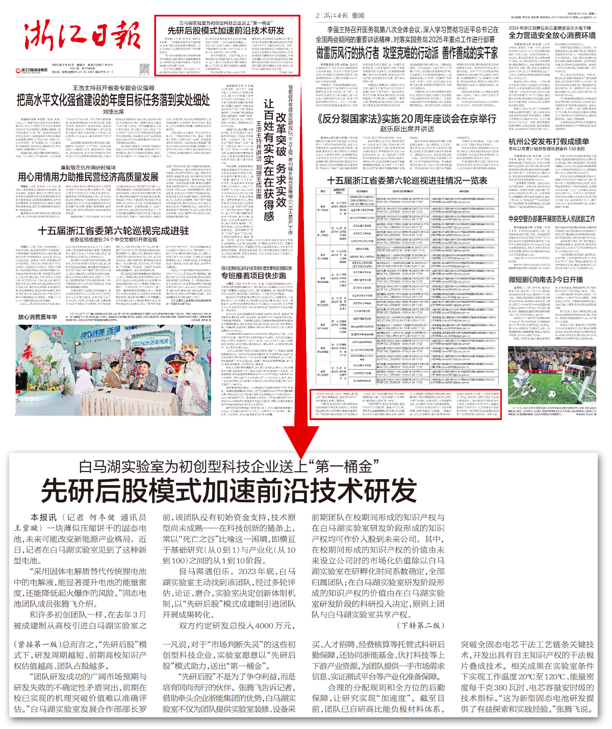 《浙江日報》3月15日頭版報眼報道白馬湖實驗室為初創型科技企業送上“第一桶金”,先研后股模式加速前沿技術研發。