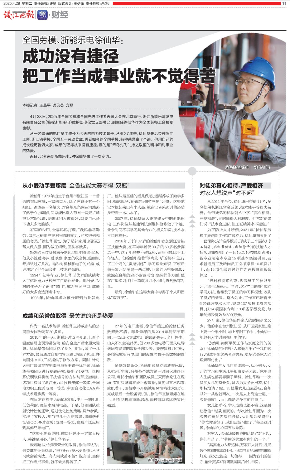 4月29日,錢江晚報(bào)報(bào)道《全國勞模、浙能樂電徐仙華:成功沒有捷徑,把工作當(dāng)成事業(yè)就不會覺得苦》。 錢江晚報(bào) 提供