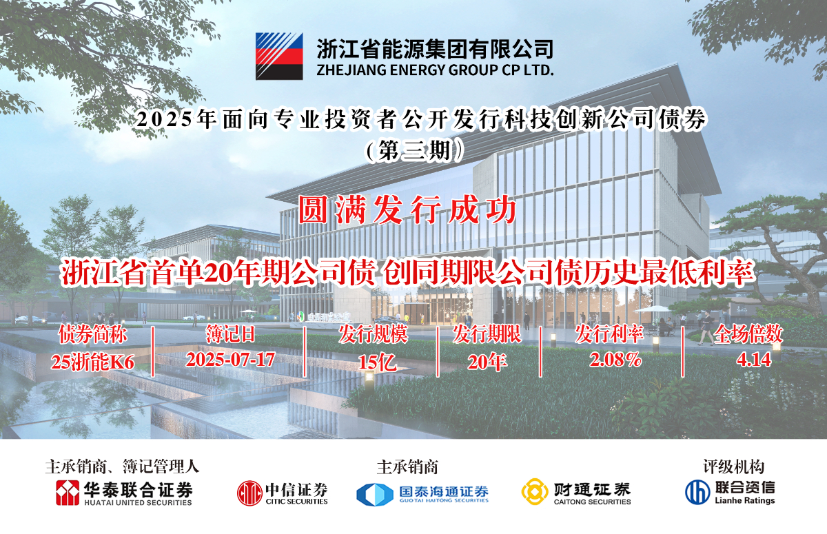 本網(wǎng)訊 7月17日,浙能集團(tuán)成功公開(kāi)發(fā)行15億元規(guī)模的浙江省首單20年期科技創(chuàng)新公司債券,票面利率2.08%,創(chuàng)同期限公司債券歷史最低利率。