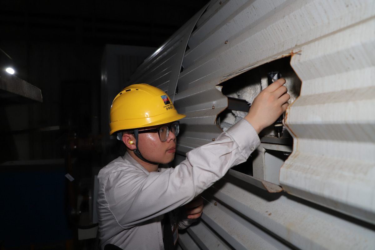 下午一點(diǎn),正是一天中氣溫和負(fù)荷的“雙高峰”,毒辣的日頭懸在毫無遮攔的天空,將室外變成一個巨大的熔爐。對講機(jī)、測振儀、點(diǎn)溫槍、手電筒……浙能溫電四控巡檢明子堯和同事清點(diǎn)好裝備,出發(fā)巡檢。他背著沉重的工具包,一步一步攀上通往本體平臺的狹窄鋼梯。很快,密集的汗水沿著安全帽帶滴落,工作服外滲出成片的汗跡。