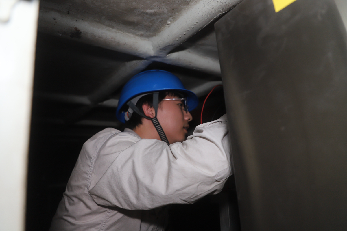 浙能溫電7號機(jī)定子溫度測點(diǎn)深藏于維修孔內(nèi)。身材高大的周超泉深吸一口氣,側(cè)身、蜷縮,將自己“塞”進(jìn)了那個狹窄的維修孔。空間逼仄無法轉(zhuǎn)身,汗水瞬間浸透工裝,肩胛輪廓在濕布下清晰凸顯。他右手持扳手在方寸間精準(zhǔn)施力,左手打光照明,將原有的溫度測點(diǎn)切換到了備用溫度測點(diǎn)。當(dāng)信號恢復(fù)平穩(wěn),他脫出“卡位”,長舒一口氣,這才感覺到整個后背的衣衫早已被汗水完全浸透,濕漉漉地緊貼在身上,勾勒出他專注工作后疲憊卻滿足的身影,正是他為保障機(jī)組“神經(jīng)末梢”敏銳暢通所付出的證明。