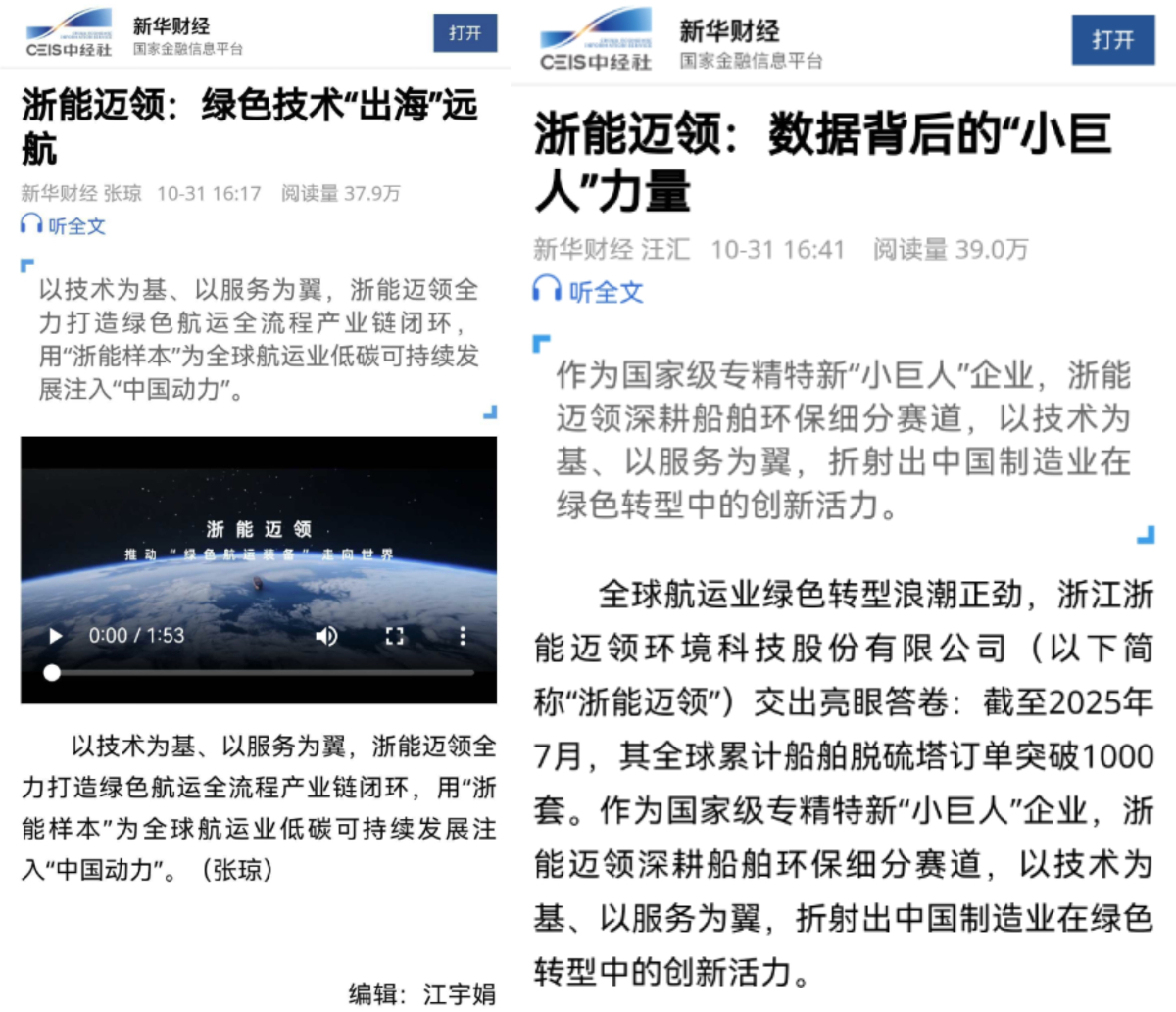 近日,新華社快看視頻號、新華社客戶端、新華財經客戶端等平臺聚焦報道浙能邁領以技術為基、以服務為翼,全力打造綠色航運全流程產業鏈閉環的實踐與成就。