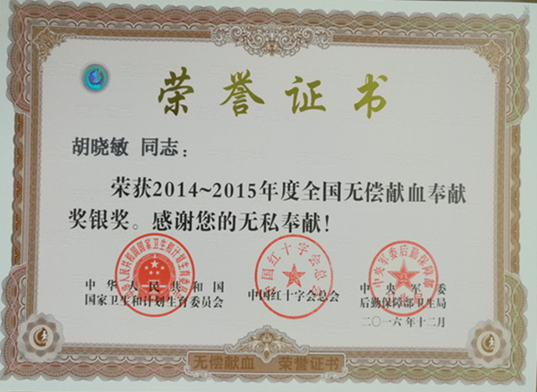近日,溫州發(fā)電公司員工胡曉敏獲全國無償獻(xiàn)血奉獻(xiàn)銀獎(jiǎng),這是他第2次獲得“全國無償獻(xiàn)血奉獻(xiàn)銀獎(jiǎng)”殊榮,也是對(duì)他多年來長(zhǎng)期堅(jiān)持無償獻(xiàn)血,關(guān)心公益事業(yè)的肯定與褒獎(jiǎng)。