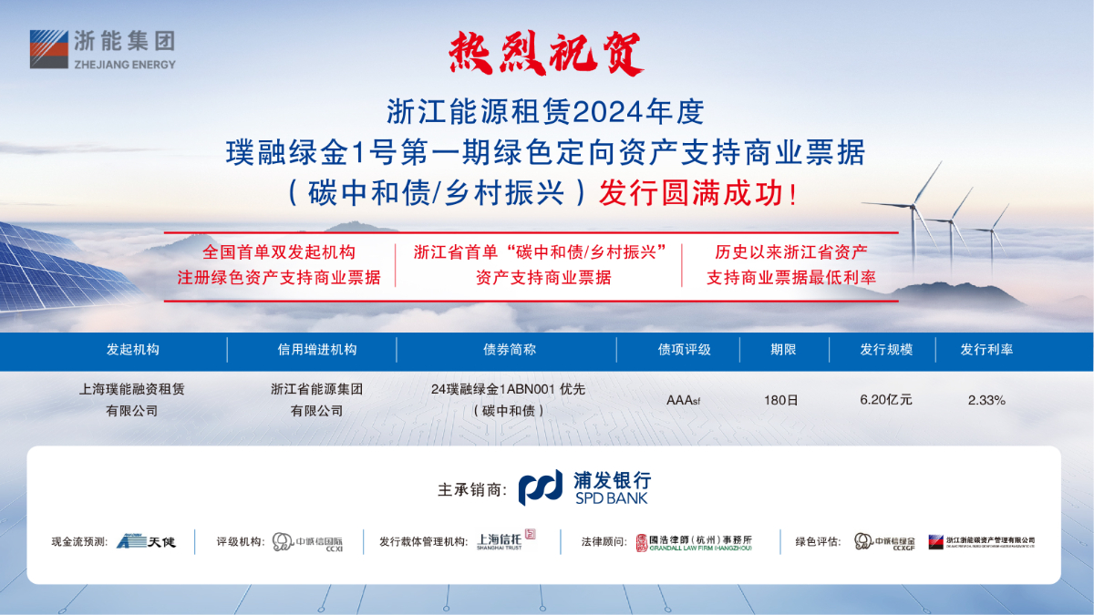 本網(wǎng)訊 1月31日,浙能集團(tuán)旗下上海璞能融資租賃有限公司成功發(fā)行浙江省內(nèi)首單“碳中和債/鄉(xiāng)村振興”資產(chǎn)支持商業(yè)票據(jù)(ABCP)。本次發(fā)行規(guī)模6.21億元,其中次級(jí)0.01億由發(fā)行人自持,優(yōu)先級(jí)獲得最高債項(xiàng)評(píng)級(jí)AAAsf,票面利率2.33%,創(chuàng)浙江省資產(chǎn)支持票據(jù)發(fā)行利率歷史新低、全國(guó)市場(chǎng)資產(chǎn)支持票據(jù)利率今年新低。
