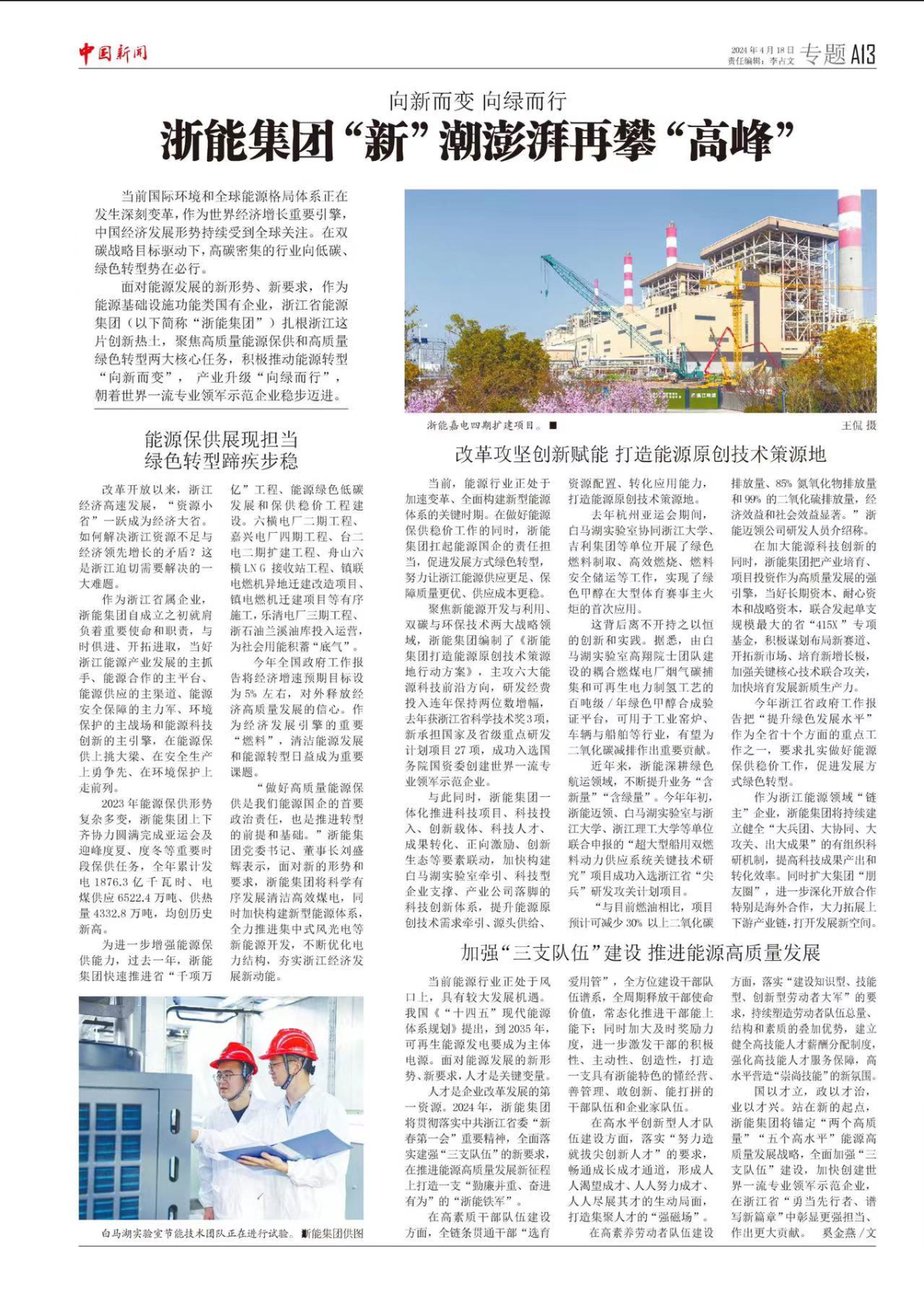 中國(guó)新聞網(wǎng)報(bào)道《浙能集團(tuán)“新”潮澎湃再攀“高峰”》。 羅漪 提供