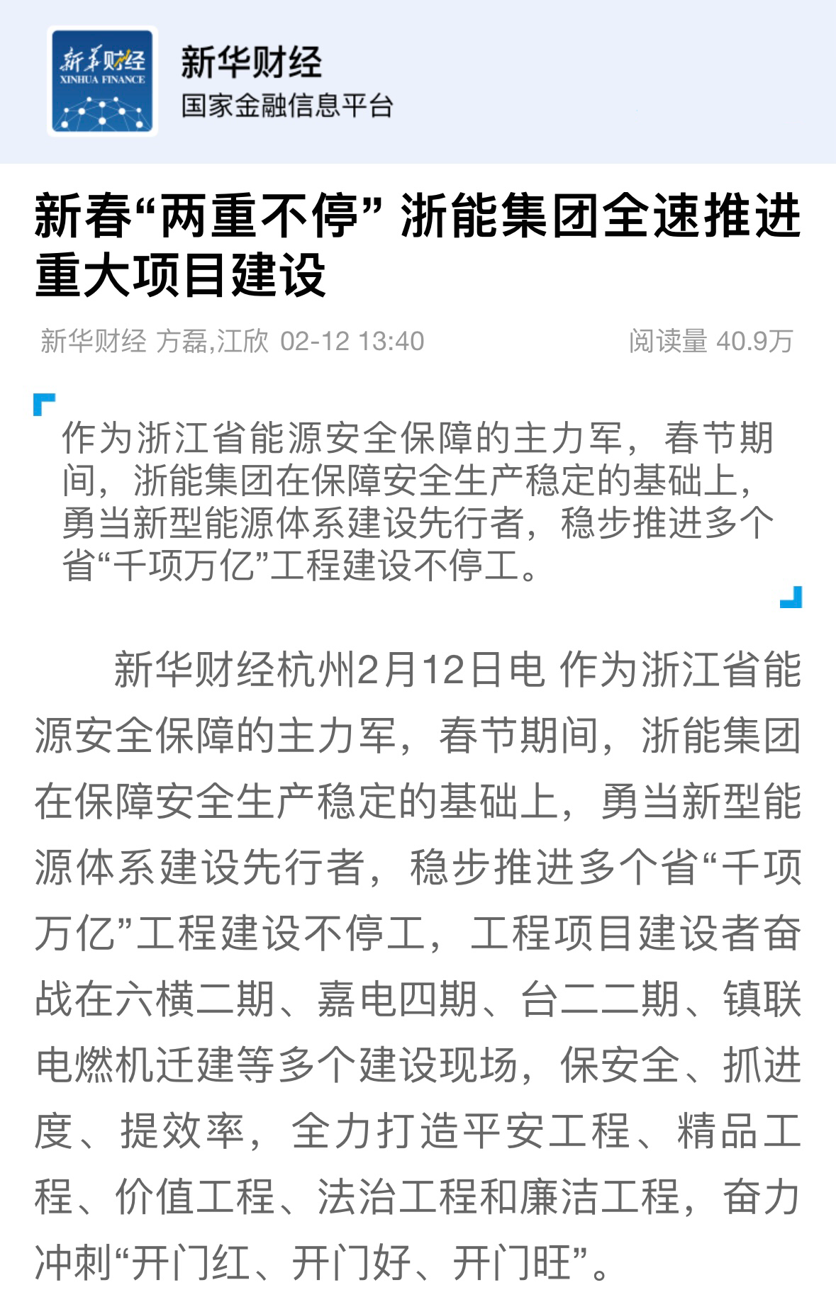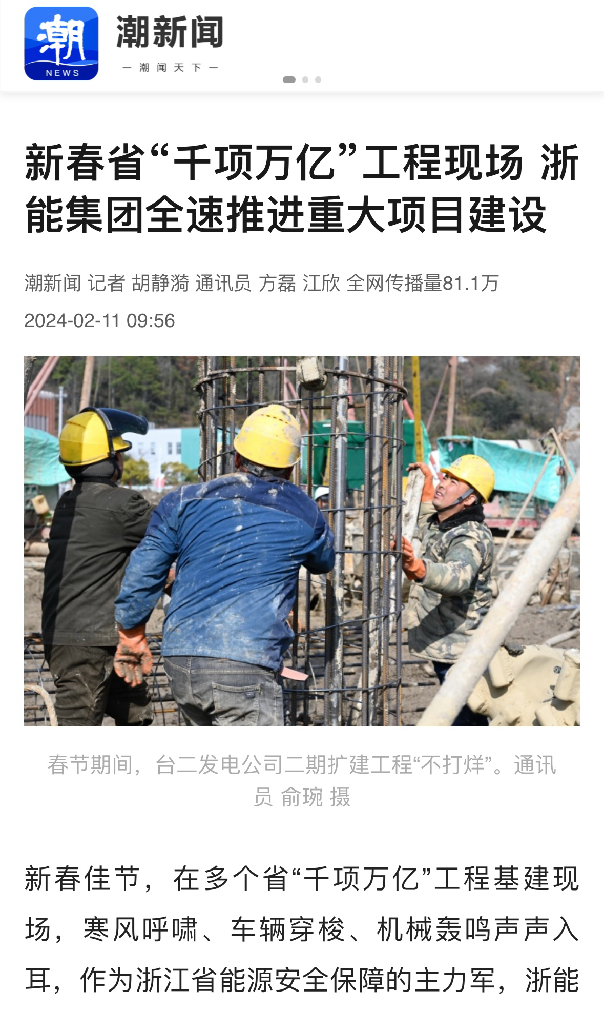 騰訊新聞報道《沖刺“開門紅”浙能集團(tuán)推進(jìn)“千項萬億”工程建設(shè)不停工》。 騰訊新聞 圖