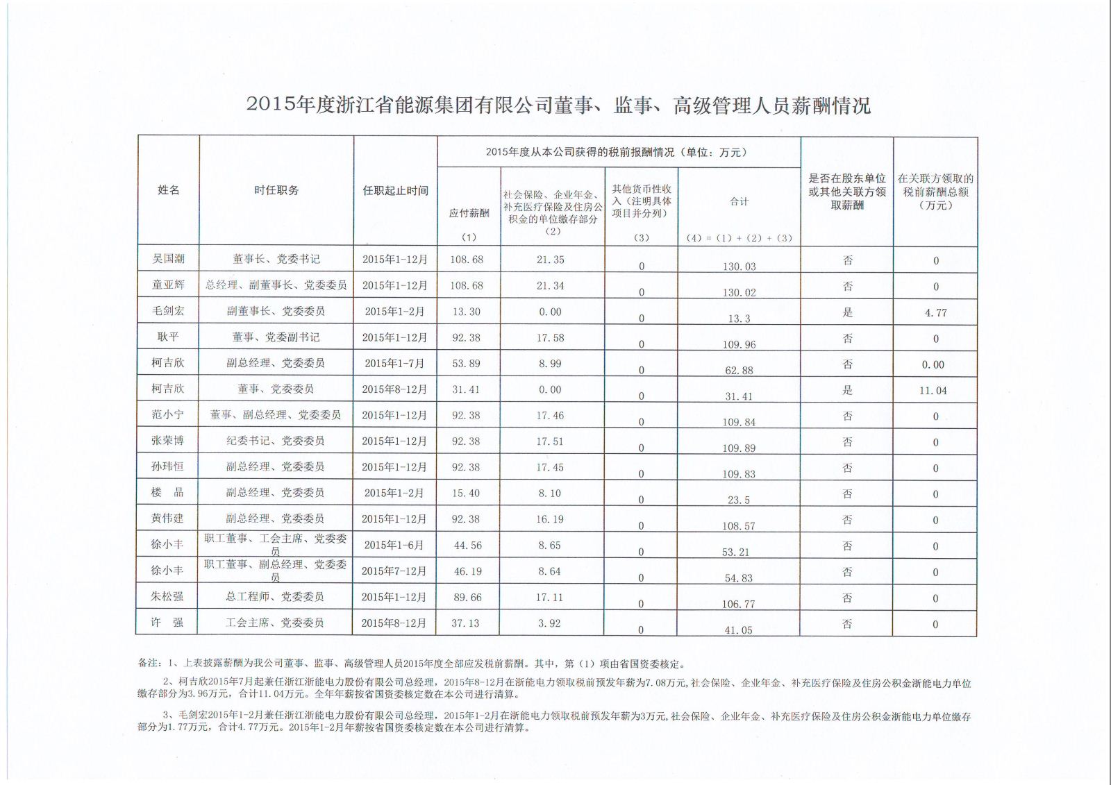 浙能集團2015年度董事、監事、高級管理人員薪酬情況